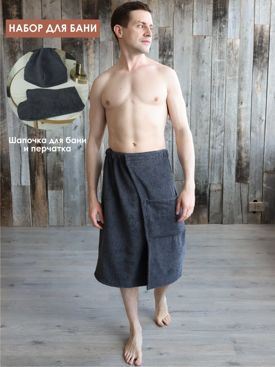 Мужской темно-серый набор для бани и сауны – это комплект красивых и удобных аксессуаров, изготовленных из мягкой махровой ткани. Они помогут вам в полной мере расслабиться и насладиться отдыхом, при этом оставаясь собой. В комплект входят: Полотенце на резинке(килт). Это эффектная и практичная замена обычному махровому полотенцу или простыне. Шапочка. Она защитит волосы от пересыхания, а голову – от перегрева. Варежка. Служит и мягкой мочалкой, и деликатным скрабом. Изделия не линяют, хорошо отстирываются, износостойкие. Набор станет полезным и практичным подарком для мужчины любого возраста