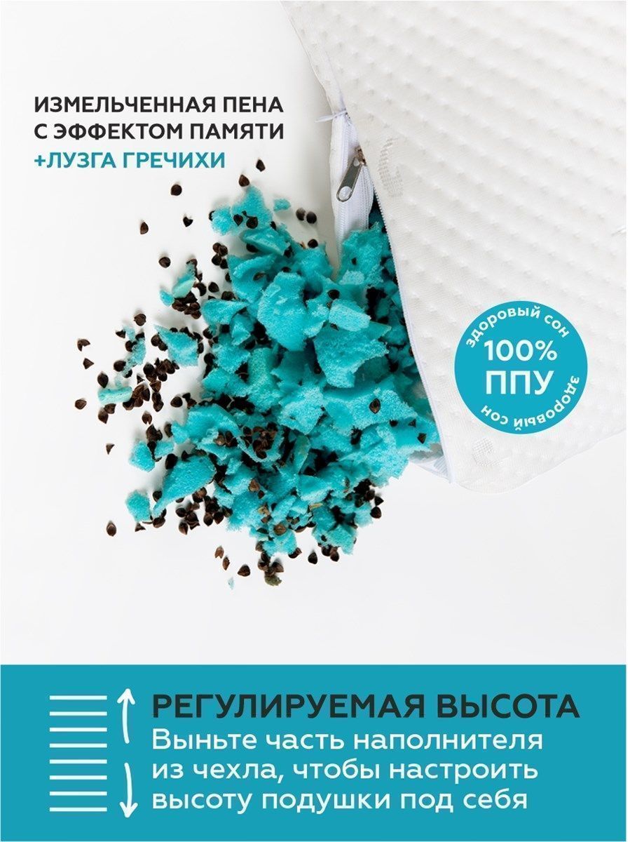 Подушка сочетает в себе инновационные и природные материалы — два вида наполнителя внутри: пенополиуретан и лузга гречихи.
