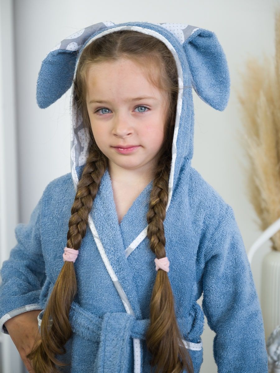 Халат для девочки с ушками зайца выглядит стильно и забавно. Контрастная окантовка из натуральной белой бязи делает махровый халат ещё более красивым, а вместительные карманы и широкий пояс обеспечивают повышенный комфорт.