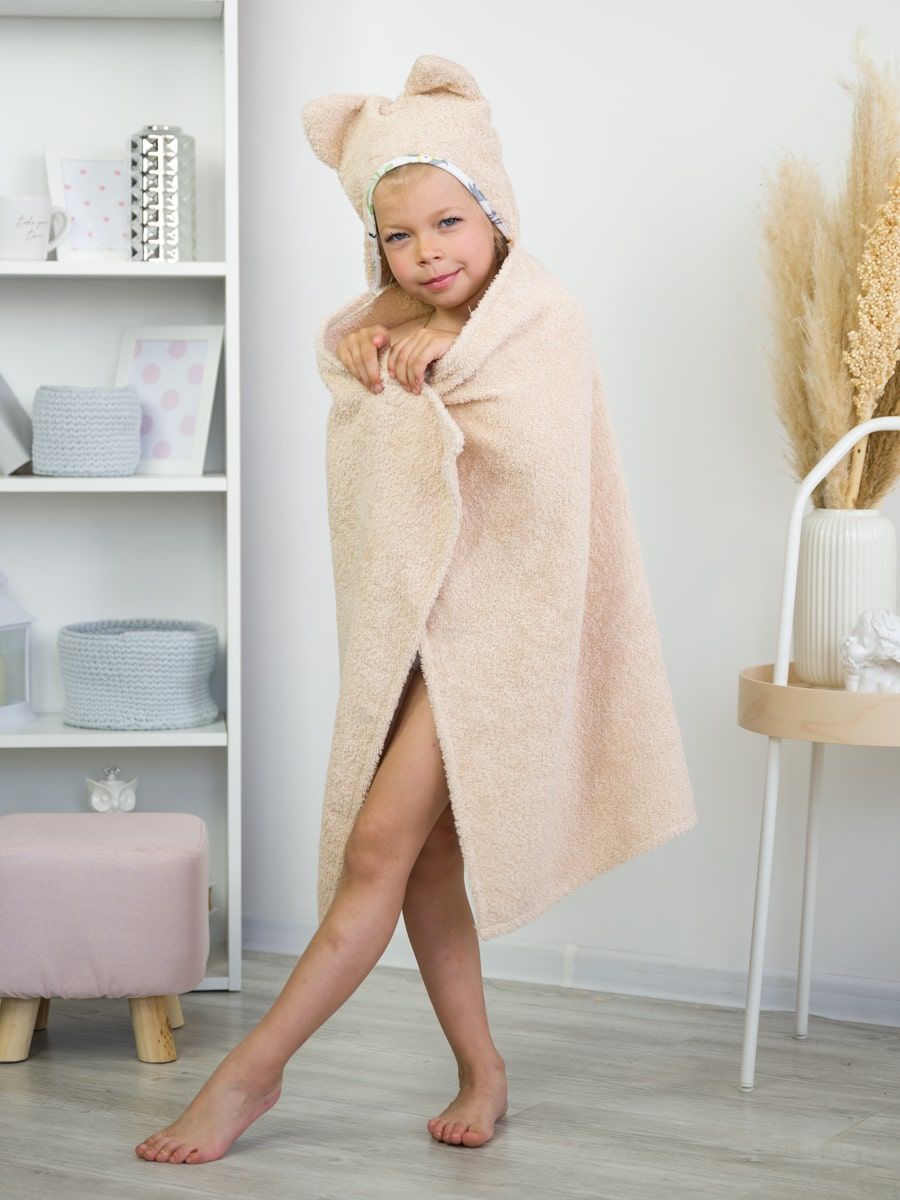 Большое полотенце с ушами кота станет незаменимым аксессуаром после купания как для новорождённых малышей, так и для подросших девочек ростом до 120 см.