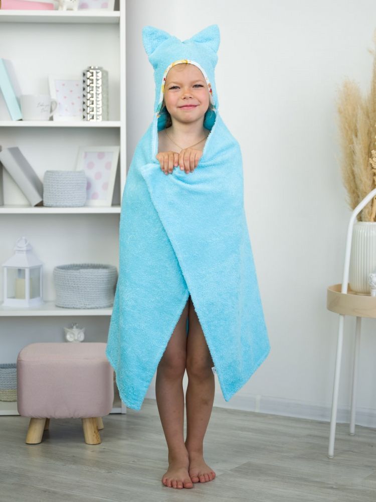 Большое полотенце с ушами кота станет незаменимым аксессуаром после купания как для новорождённых малышей, так и для подросших девочек ростом до 120 см.