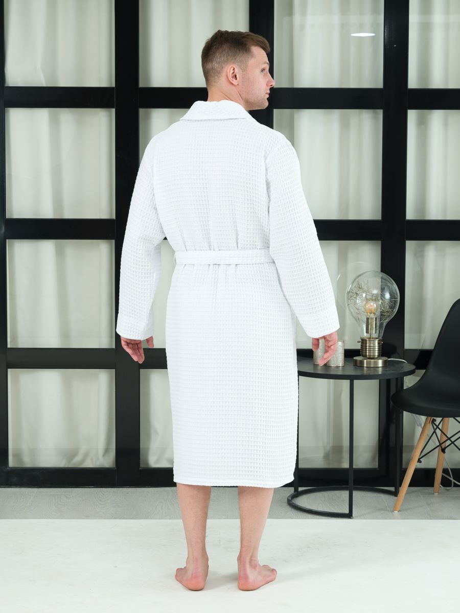 Халат достаточно легкий, а мелкие квадратики вафельной ткани создают воздушную подушку между халатом и кожей, за счет чего сохраняется комфортная температура тела, а после водных процедур кожа быстрее высыхает.